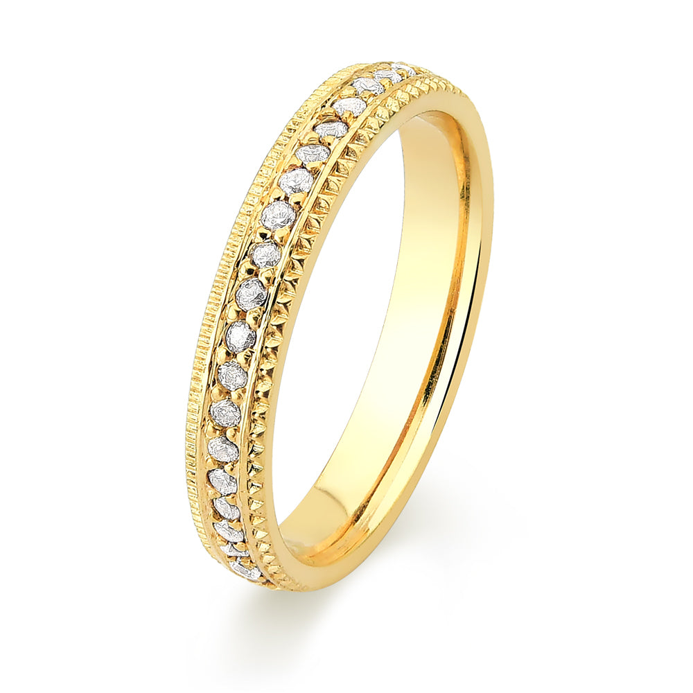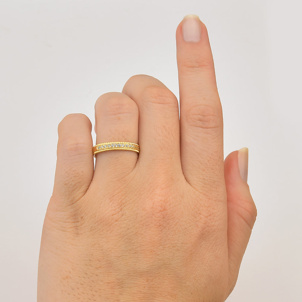 Aliança de Ouro 18K com Meia Volta de Pedras e Borda Trabalhada