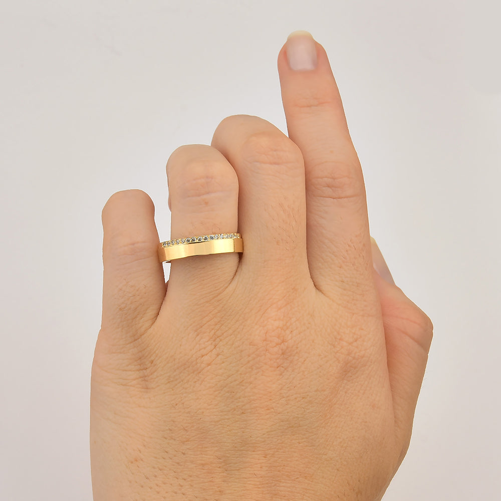 Metal: ouro 18K Opção de gemas: Moissanite VVS1 cor D Diamante de Laboratório VVS cor DEF Tamanho da gema central: 5mm (50pts) ou 5,5mm ( ≈70pts) Tamanho das gemas laterais: 1,3mm Largura total: 5mm ou 5,5mm (dependendo do tamanho da pedra central) Largura do...